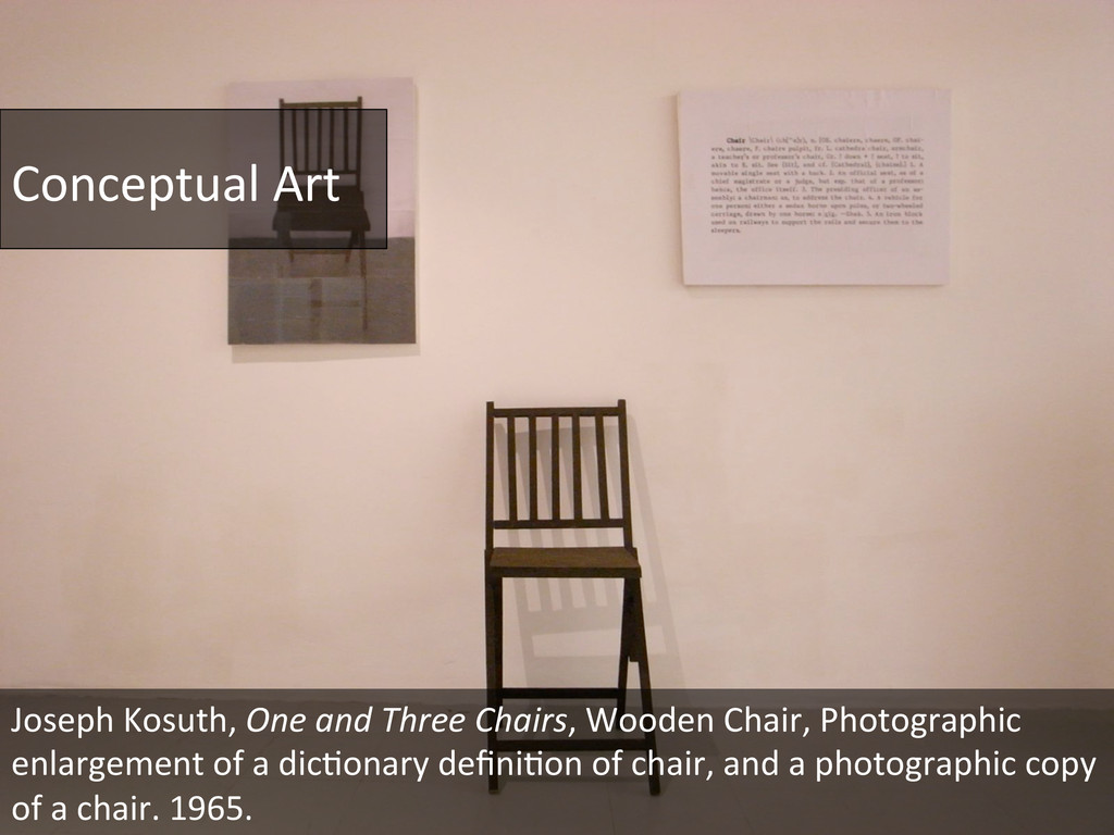 99) joseph kosuth's one and three chairs consists of _____... 99) joseph kosuth's one and three chairs consists of _____. His most celebrated work is one and three chairs (1965), which doubles as a piece of commentary on plato's theory of forms. 01.10.2012 · joseph kosuth is an american conceptual artist, philosopher and essayist. 01.10.2012 · joseph kosuth is an american conceptual artist, philosopher and essayist.
